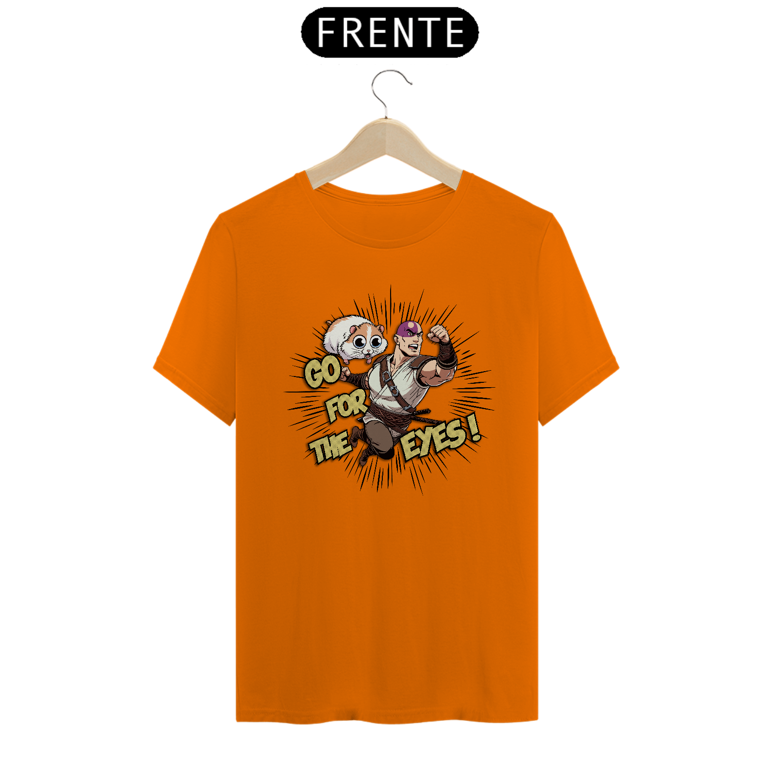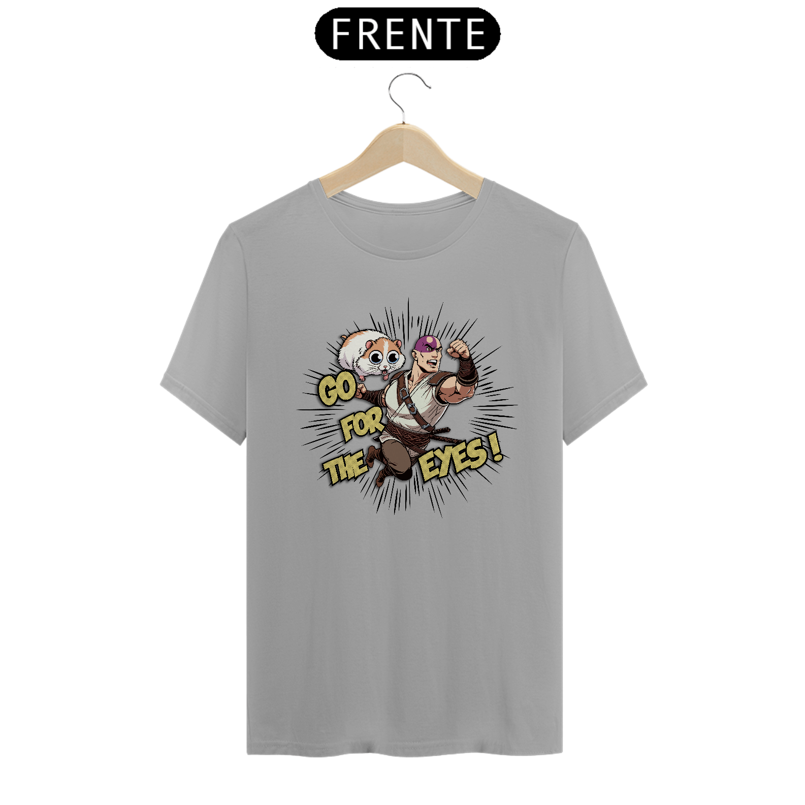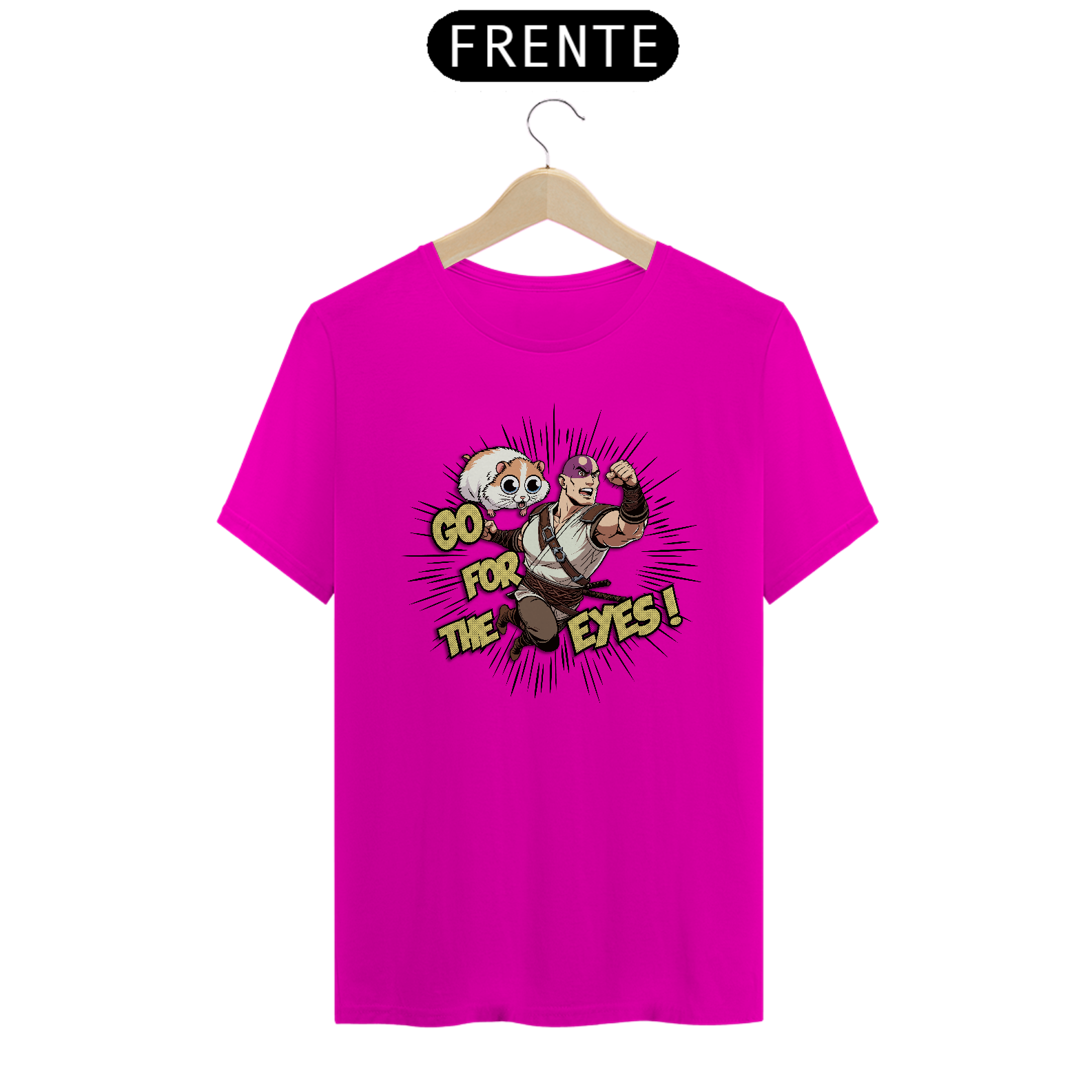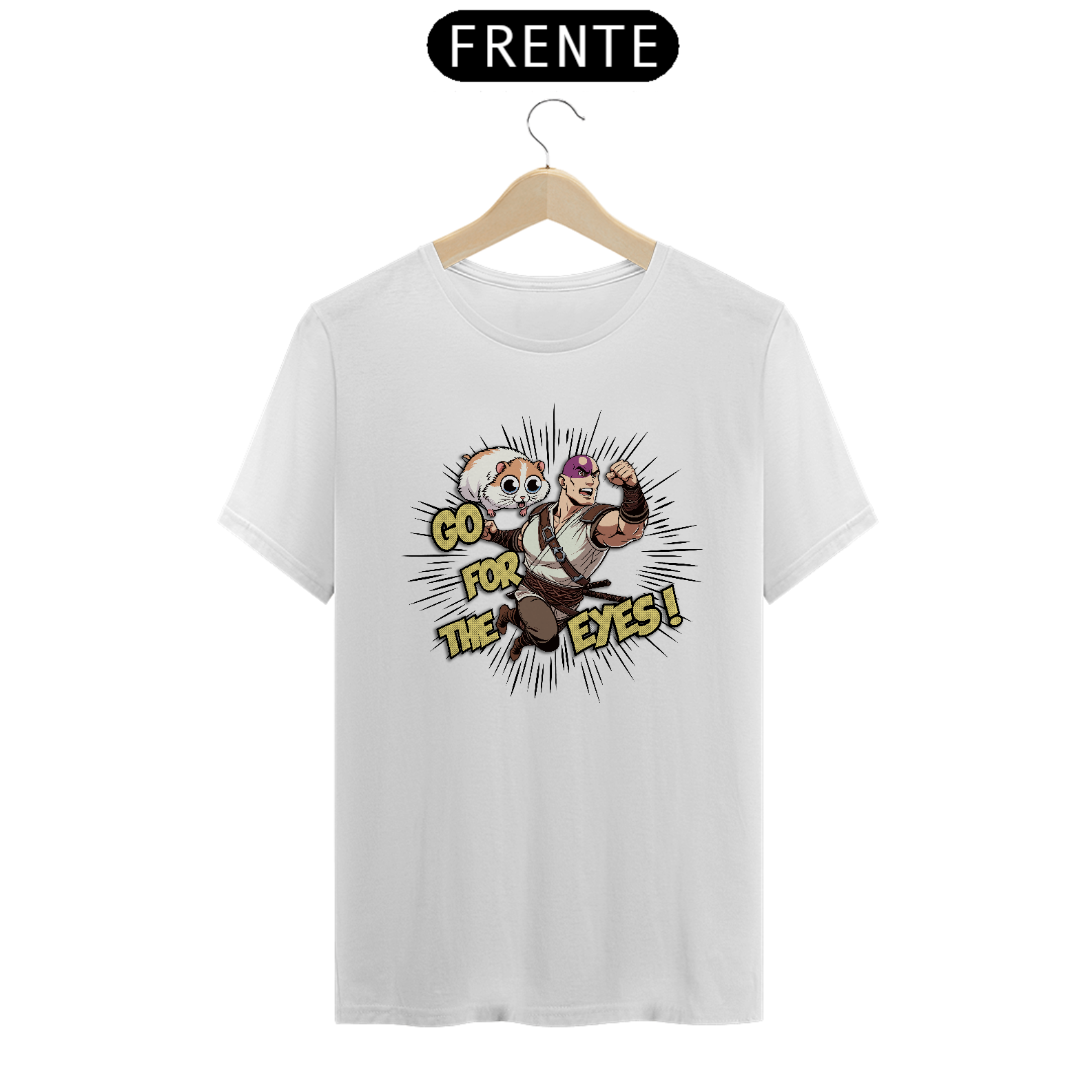 Com a camiseta "Go for the Eyes", você entra na pele de Minsc, o amado ranger de Baldur's Gate, com seu lema de batalha e seu destemido companheiro, o hamster Boo. O design captura a essência da valentia e do humor que torna Minsc uma figura lendária nos RPGs.