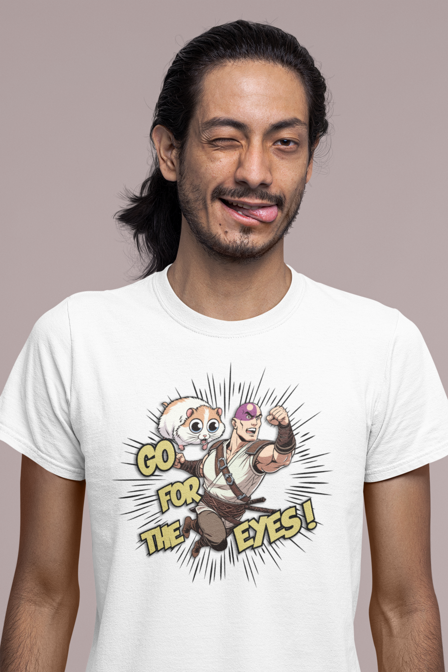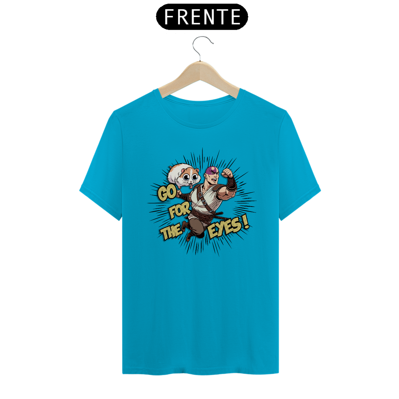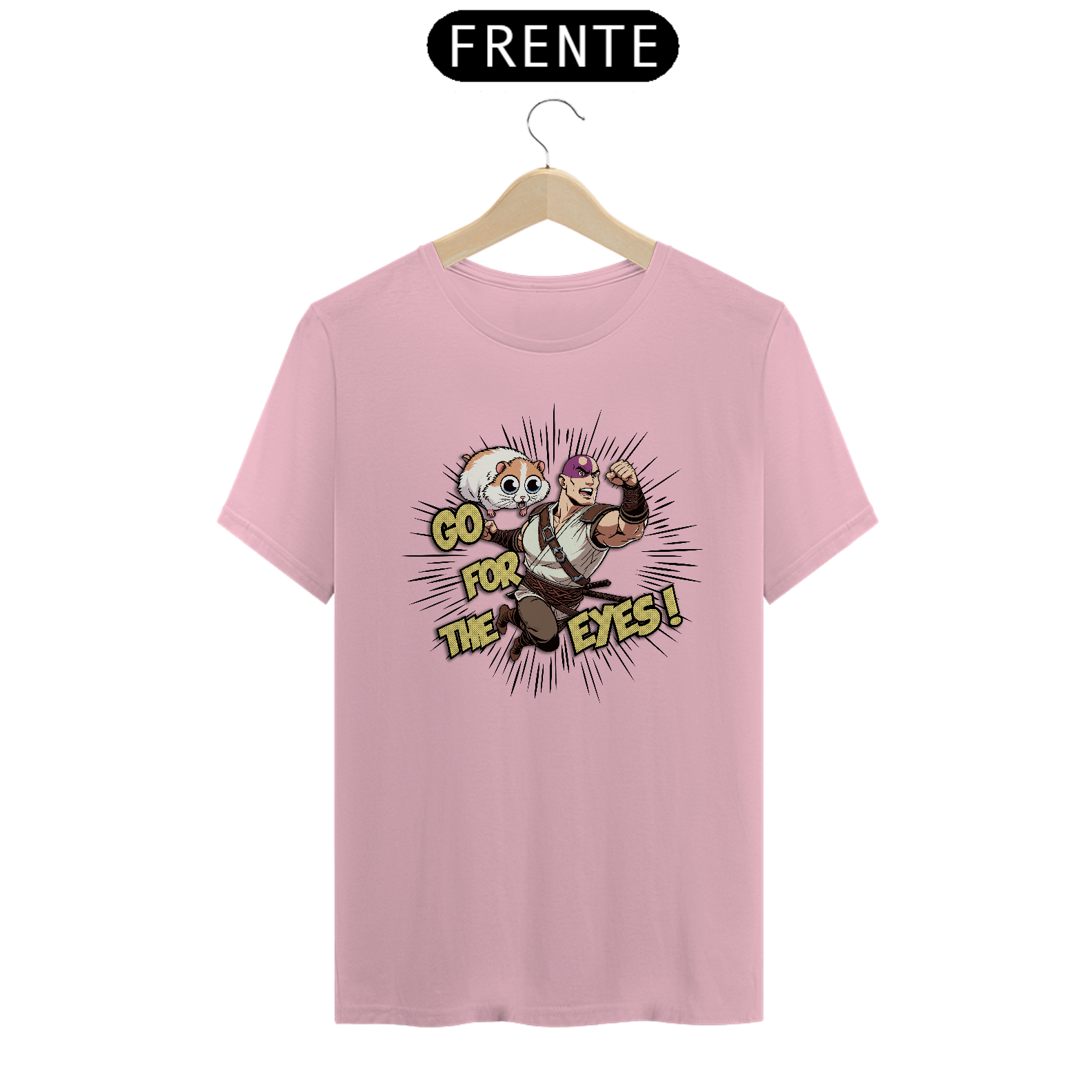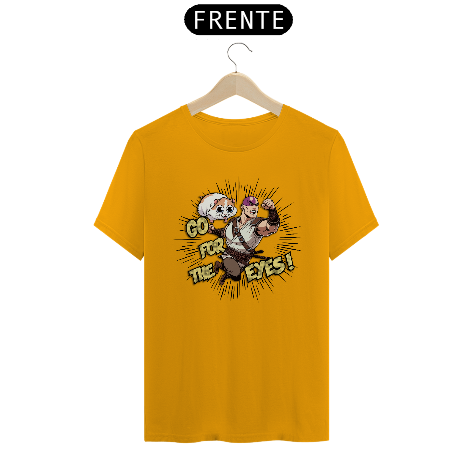 Com a camiseta "Go for the Eyes", você entra na pele de Minsc, o amado ranger de Baldur's Gate, com seu lema de batalha e seu destemido companheiro, o hamster Boo. O design captura a essência da valentia e do humor que torna Minsc uma figura lendária nos RPGs.