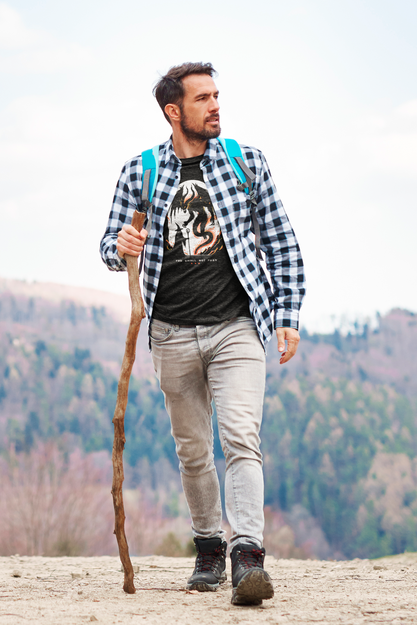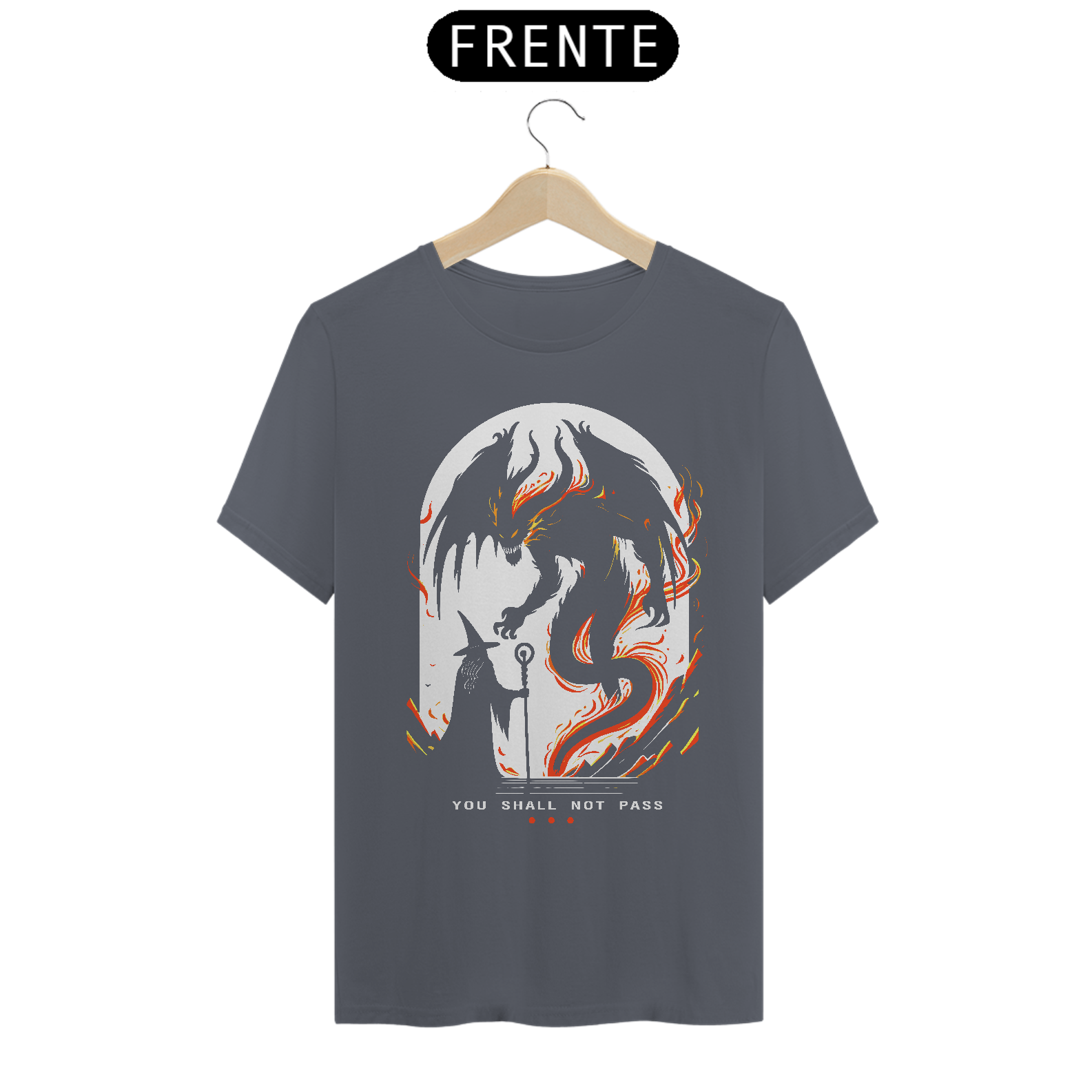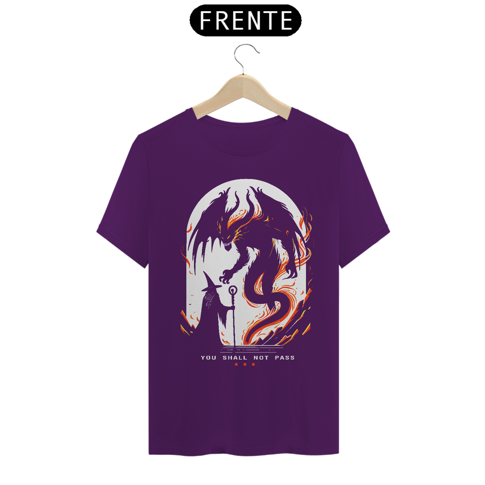 A "Camiseta - LOTR You Shall Not Pass Minimal" traz um momento icônico de "O Senhor dos Anéis", onde Gandalf enfrenta o Balrog na ponte de Khazad-dûm. A arte minimalista captura essa cena épica, complementada pela frase imortal "You shall not pass".