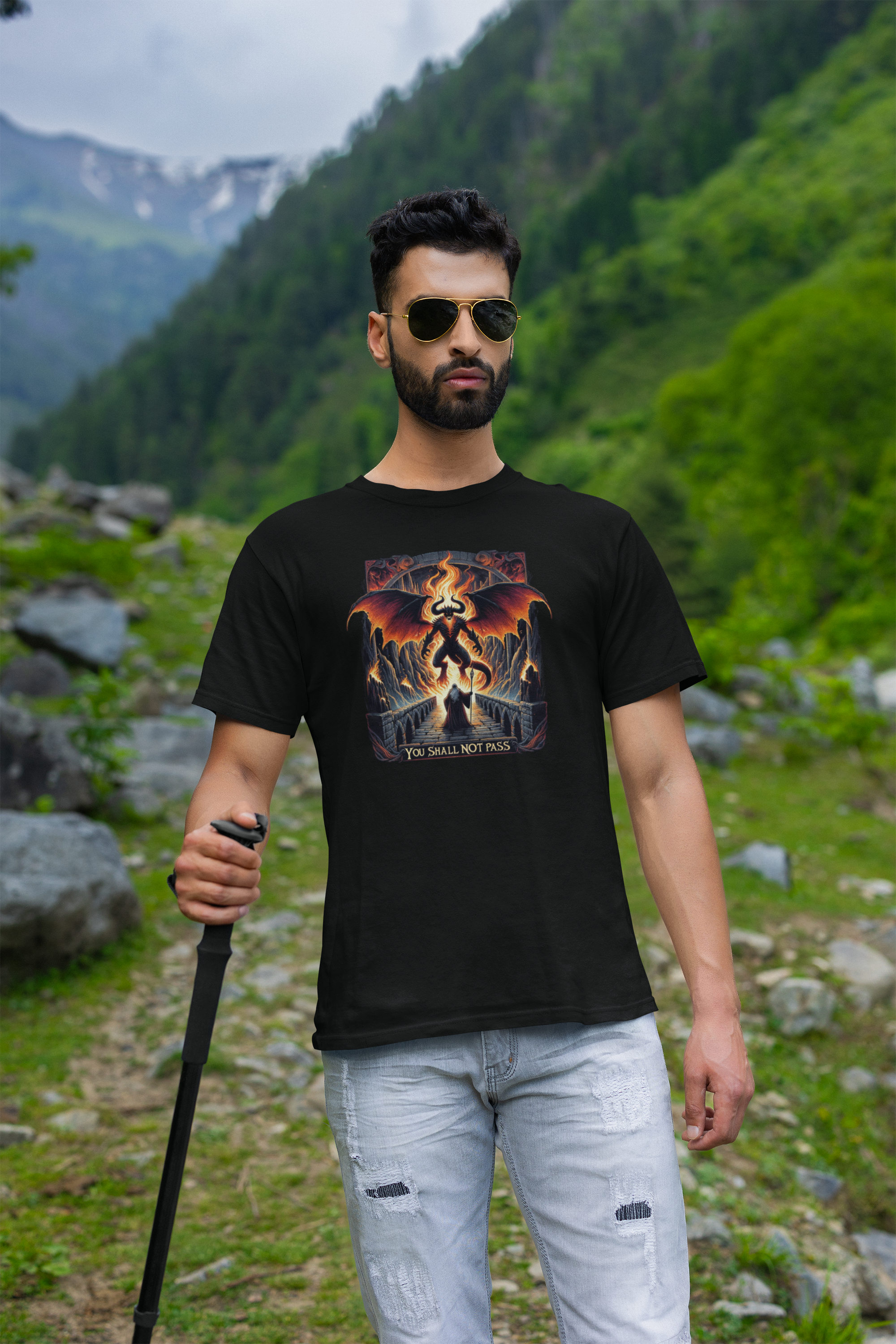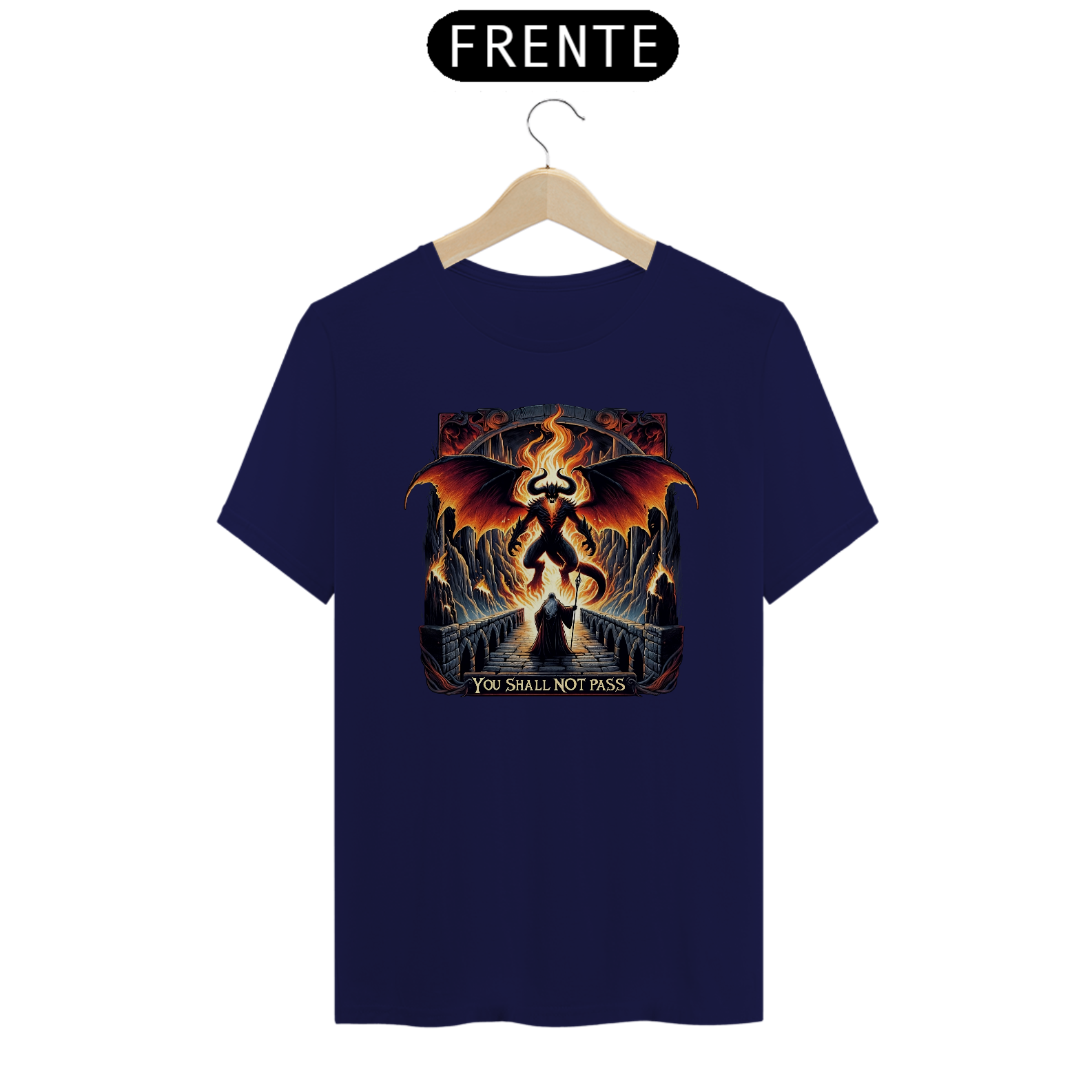 A "Camiseta - LOTR You Shall Not Pass" apresenta uma representação detalhada de um dos confrontos mais épicos de "O Senhor dos Anéis": Gandalf desafiando o Balrog na ponte de Khazad-dûm. Enriquecida com a lendária frase "You shall not pass", esta peça captura a tensão e a dramaticidade do momento.