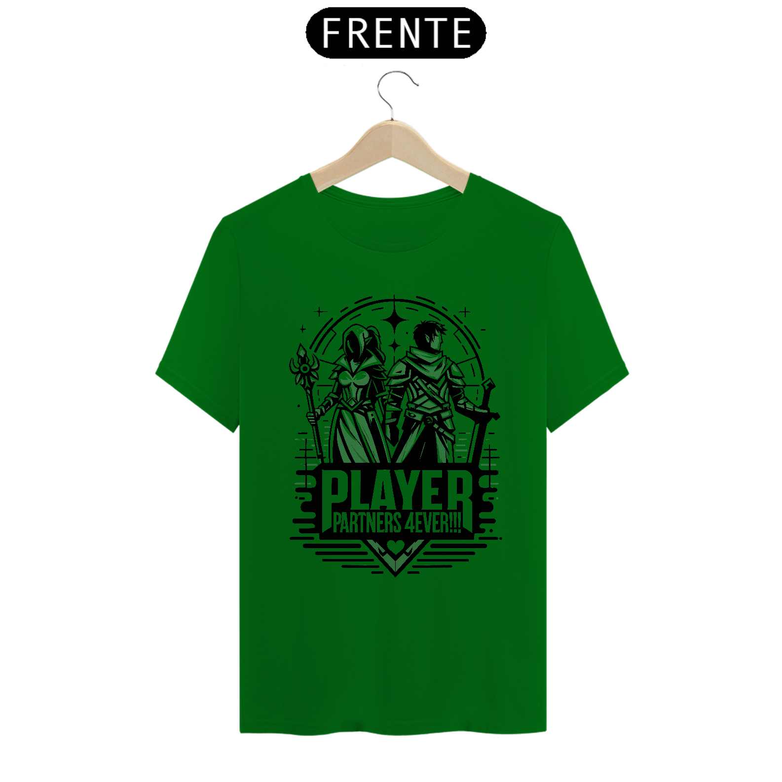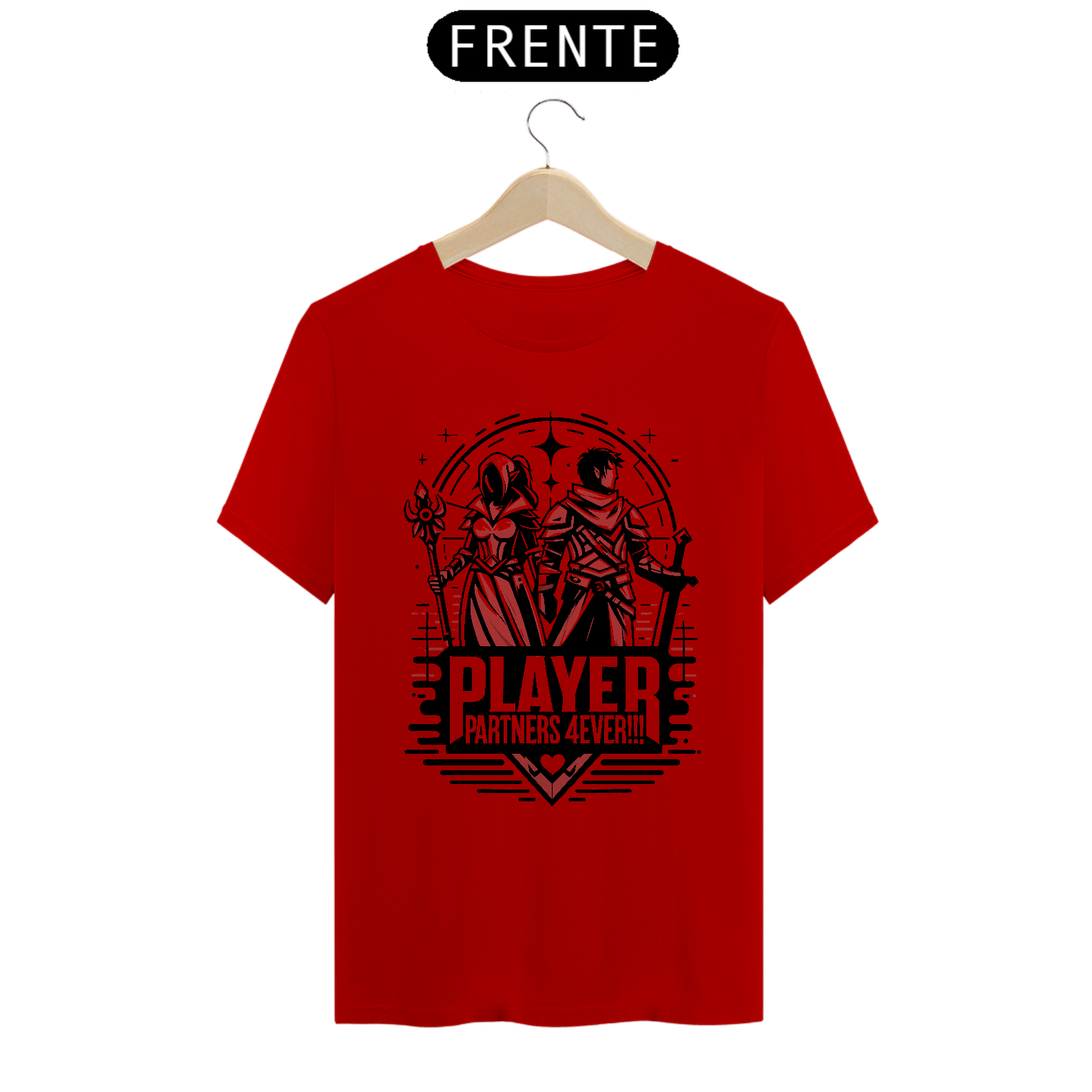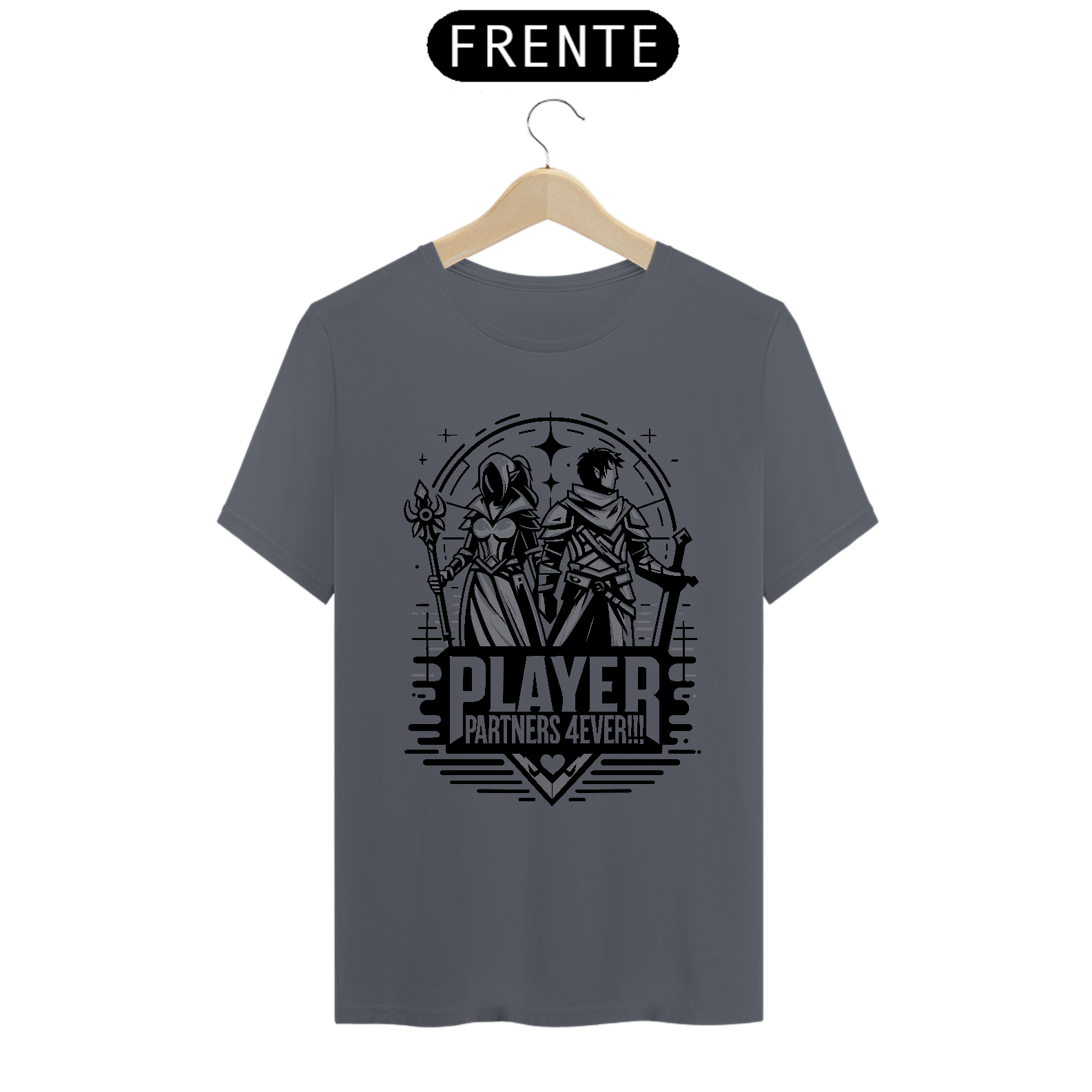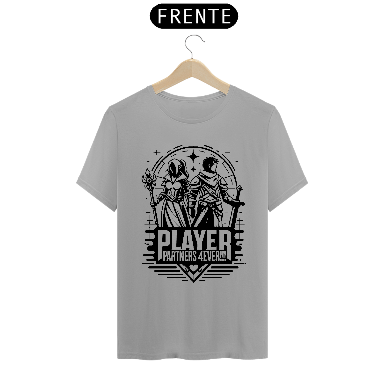 A camiseta "Player Partners 4Ever" celebra os laços eternos entre casais que compartilham a paixão pelos mundos de RPG. Nela, dois guerreiros se perfilam lado a lado, símbolos do companheirismo e aventura que só casais gamers entendem. A arte destila o espírito de cumplicidade em cada detalhe, prometendo ser tão duradoura quanto as campanhas que enfrentam juntos.