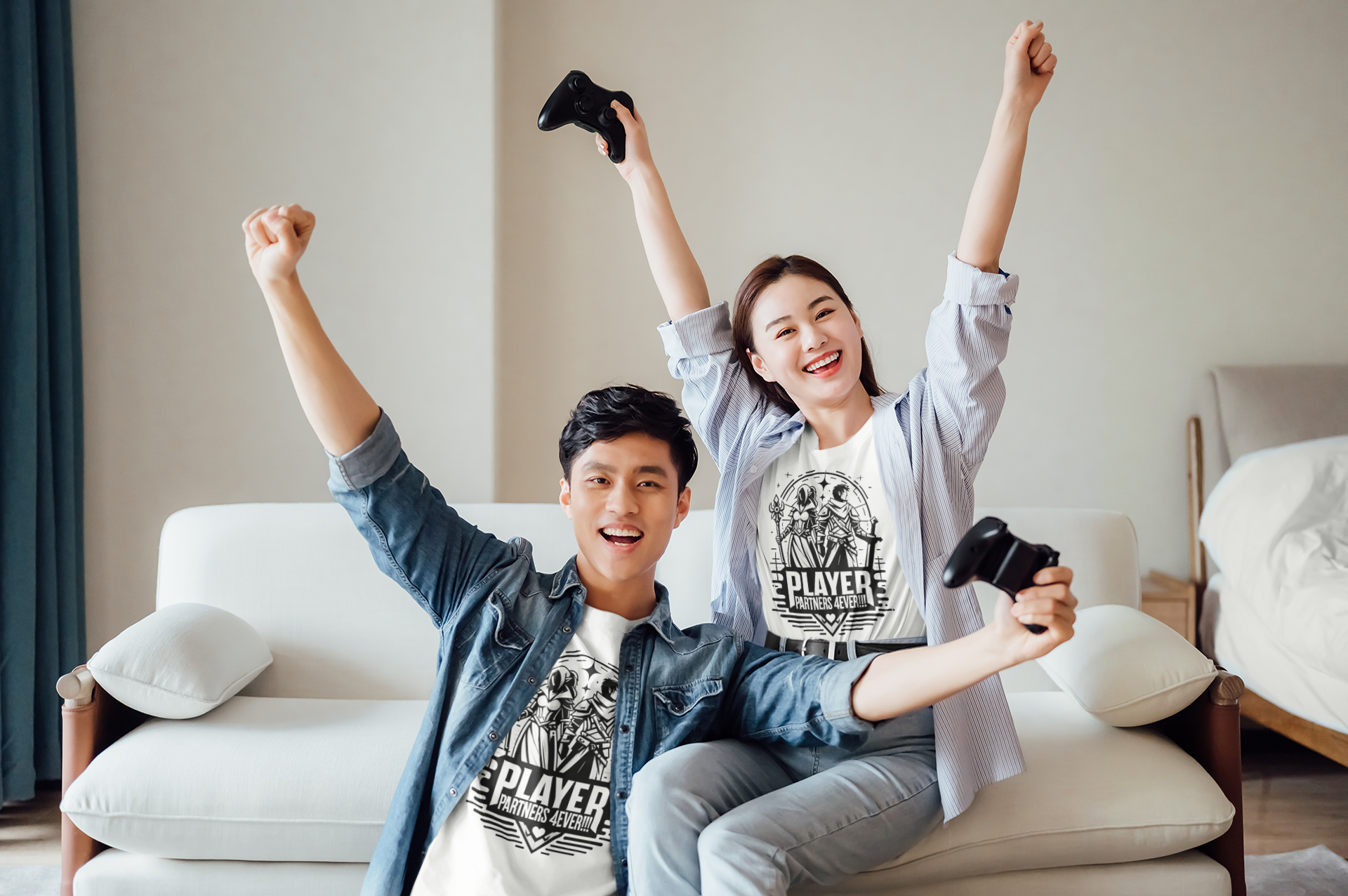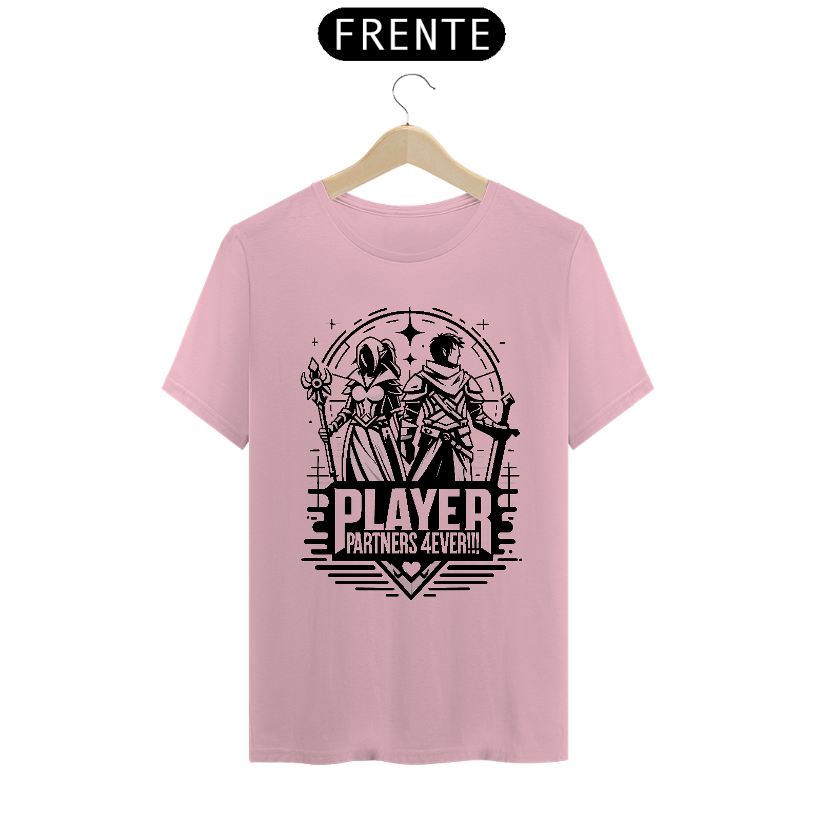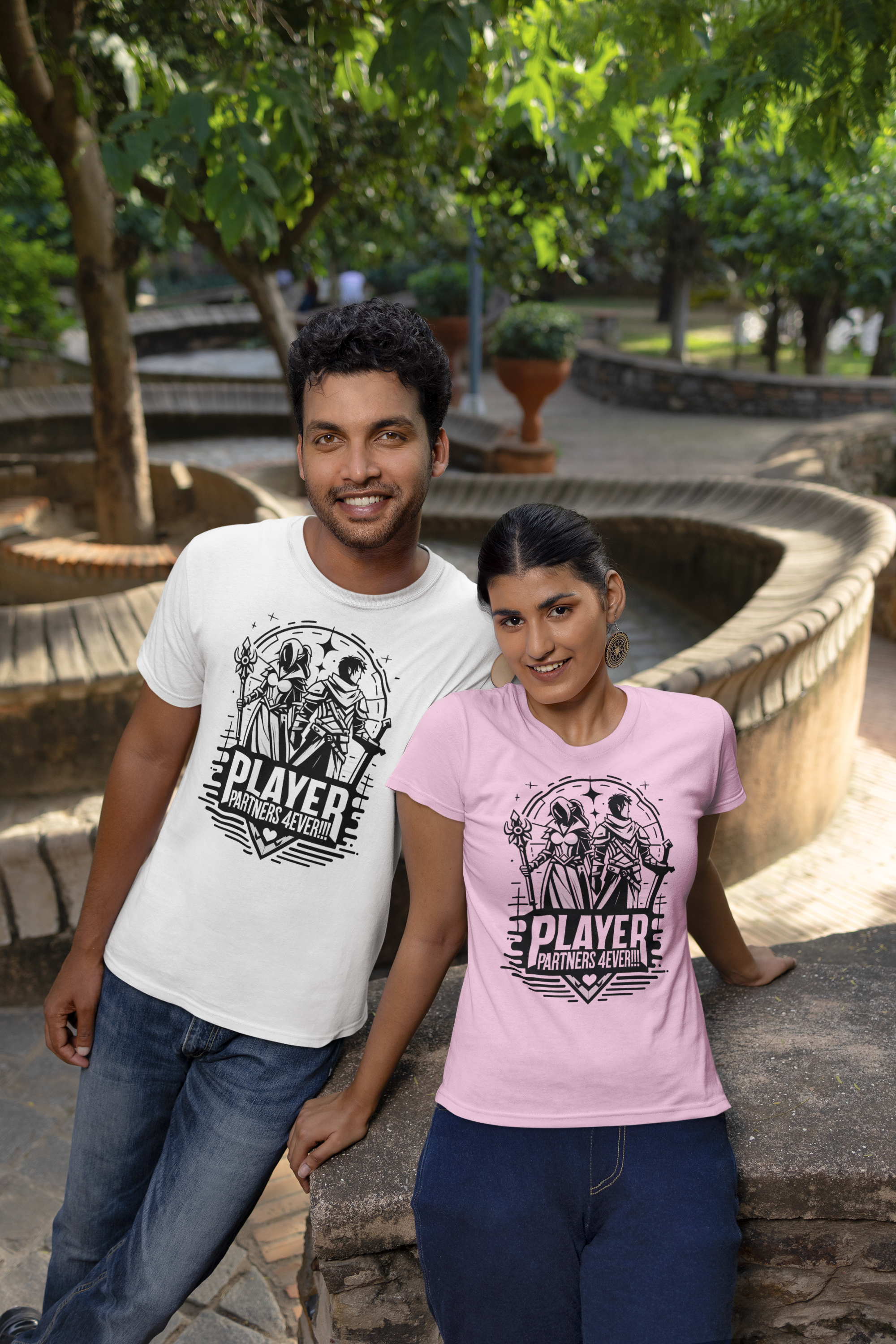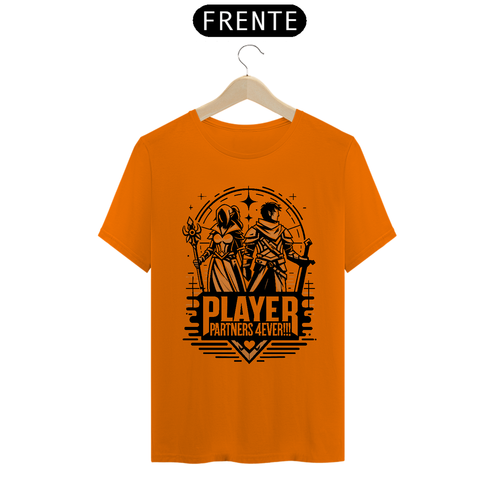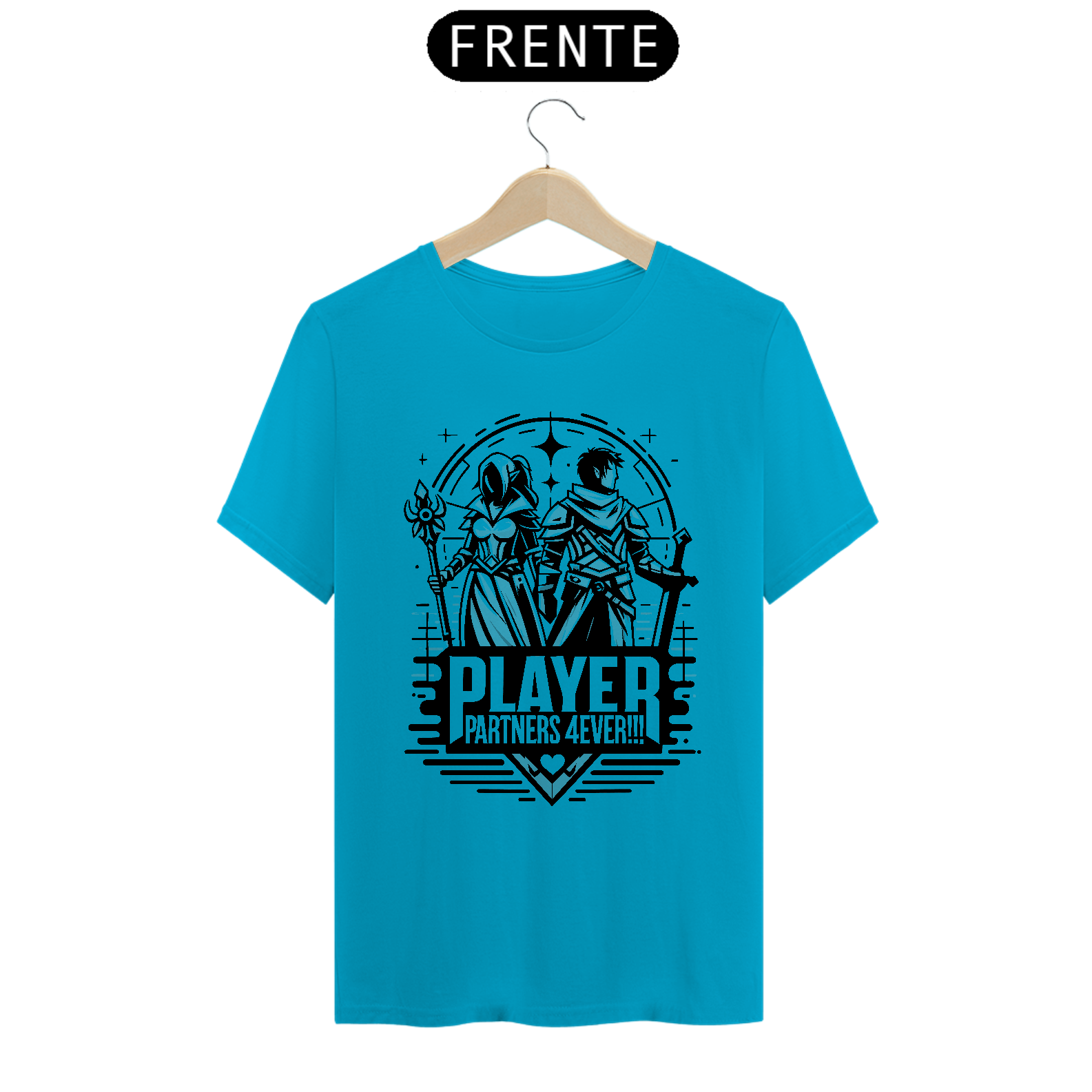 A camiseta "Player Partners 4Ever" celebra os laços eternos entre casais que compartilham a paixão pelos mundos de RPG. Nela, dois guerreiros se perfilam lado a lado, símbolos do companheirismo e aventura que só casais gamers entendem. A arte destila o espírito de cumplicidade em cada detalhe, prometendo ser tão duradoura quanto as campanhas que enfrentam juntos.